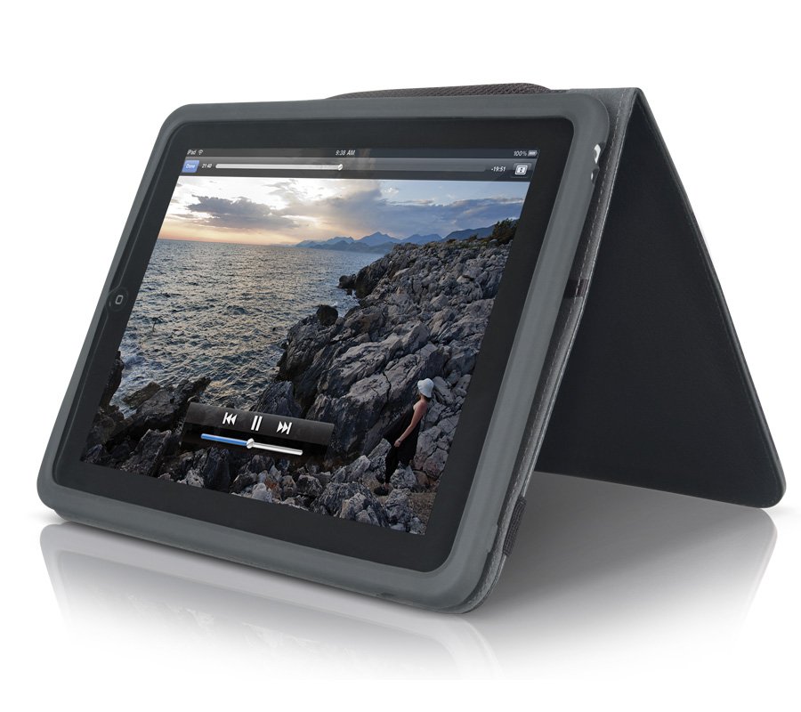These innovative iPad speakers are built into a durable case/stand that offers great sound and protects your iPad or iPad 2. The flat NXT™ stereo speakers provide great sound that’s perfect for your music, games, videos or apps. The case can be configured as a six-position stand for easy typing or watching movies, etc. The built-in lithium-ion battery is rechargeable via the included USB cable, so you can enjoy music on the go without worrying about batteries. Ideal for travel, home or office.